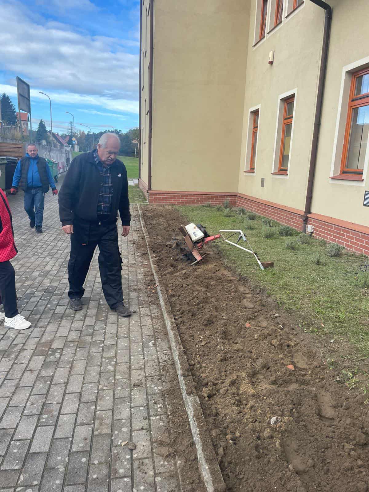 23.10.2025 dzięki pomocy i życzliwości kolejnego krośniczanina p. Stanisława Burdy, który udostępnił nam gelboglezarkę została spulchniona ziamia i wymieszana z kupiony podłożem do róż. Tym samym zgodnie ze wskazówką historycznego ogrodnika p. Ignacego Łaniaka, który mawiał "różom trza dać powietrzo" rabaty zostały przygotrowane na sobotę.