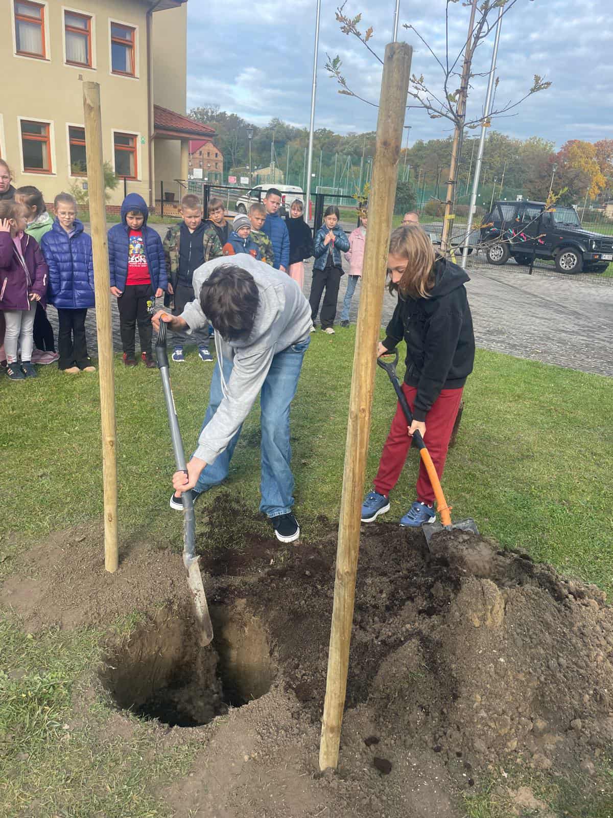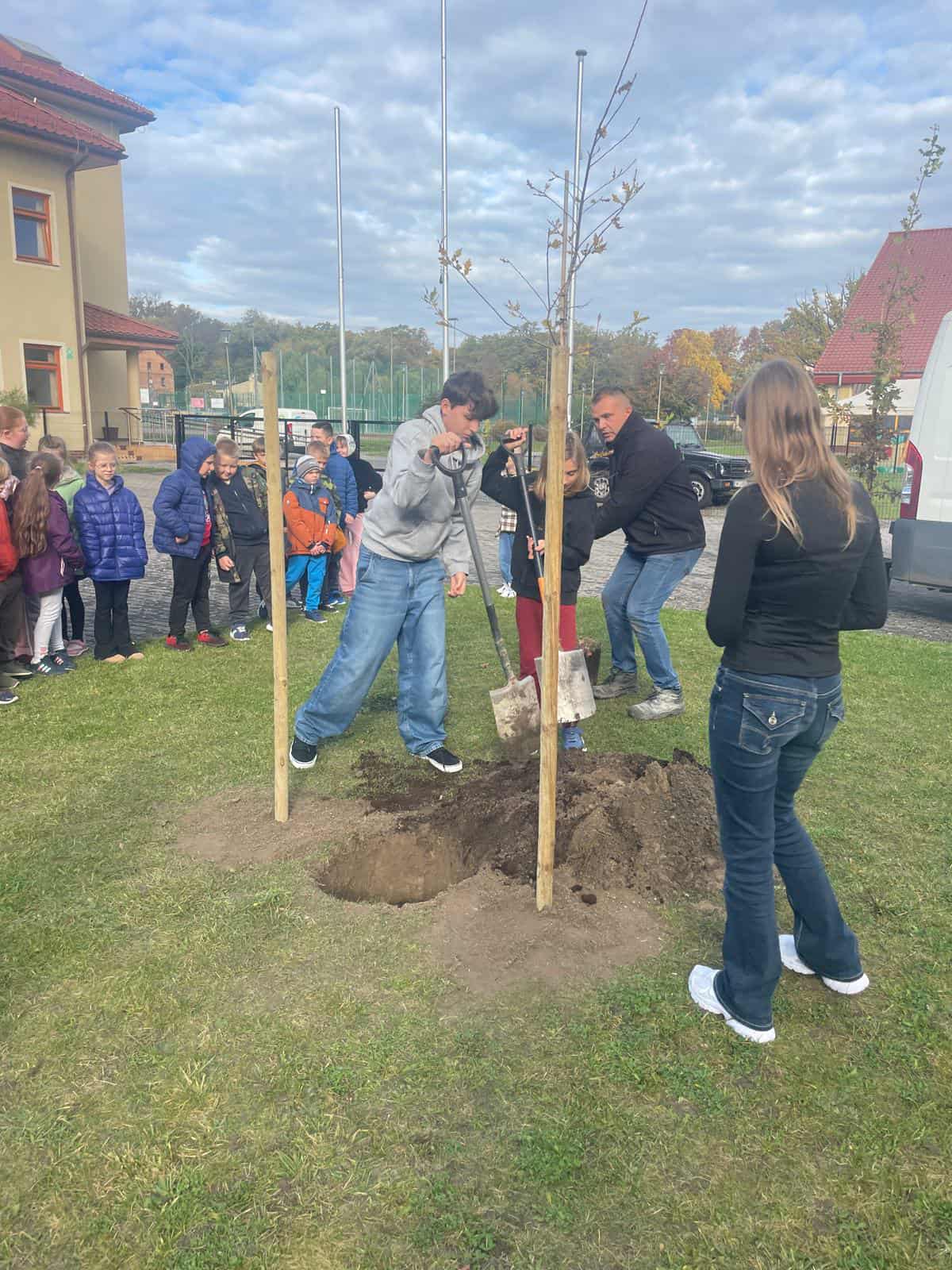 Tego samego dnia dzięki wsparciu krośniczanina p. Mariusza Ziemniaka pracownik jego firmy pomóg uczniom szkoły nasadzić dab pamięci z okazji 80-lecia szkoły (sadzonka zaplanowana w projkcie i sfiansowana ze środków projektu). Młodzież sadząc drzewo pod jego korzenie włożyła kapsułę czasu, do której włożyli pamiątki z obchodów jubileuszu, zdjęcia, wspomnienia absolwentów, folder z histroią szkoły, długopis z jubileuszowym grawerem, pierścionek wukonany na drukarce 3D oraz list do kolejnych pokoleń.