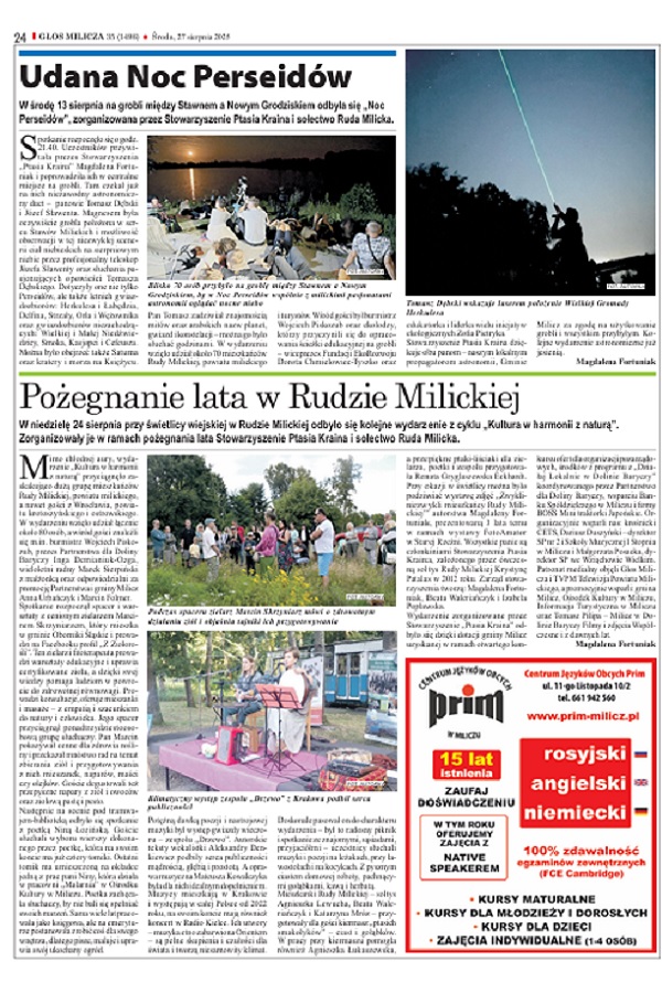Głos Milicza opublikował dwa artykuły autorstwa Magdaleny Fortuniak o naszych dwóch wydarzeniach - drugim koncercie w ramach projektu Kultura w harmonii z naturą i Nocy Perseidów, którą realizowaliśmy poza projektem - było to już drugie wydarzenie poświęcone obserwacji gwiazd, które przyciągneło licznych mieszkańców z terenu całego powiatu.