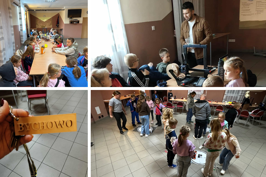 Druga część warsztatów przeniosła uczestników w świat projektowania 3D. Dzieci poznały podstawy wymiarowania i pracy w przestrzeni cyfrowej, a efektem wspólnych działań była wydrukowana tabliczka z nazwą wsi Bychowo – powstała na miejscu, na oczach uczestników.