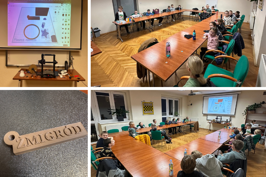 Następnie młodzi technicy przenieśli się do świata modelowania 3D. Tworzyli własne przestrzenne projekty: wazony, figurki oraz elementy miniaturowej zabudowy. Ich prace ożyły na oczach wszystkich dzięki drukarce 3D, które krok po kroku budowała modele. Kulminacyjnym punktem spotkania był wspólny projekt – personalizowana tabliczka z nazwą Żmigrodu, zaprojektowana i wykonana przez uczestników.