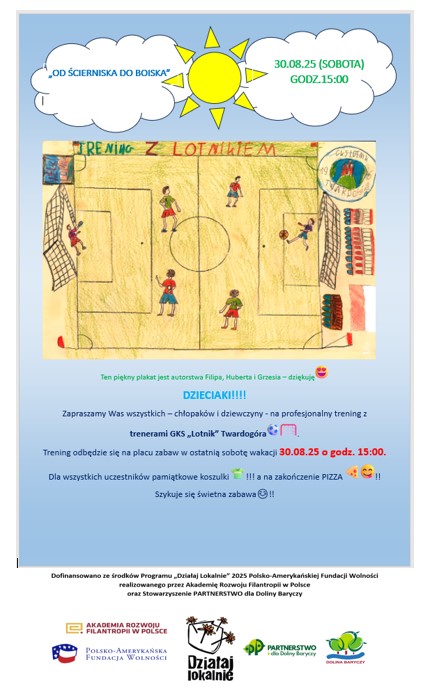 Dzięki wsparciu finansowemu z grantu Polsko-Amerykańskiej Fundacji Wolności oraz szczodrym datkom od lokalnych przedsiębiorców: Usługi Rolnicze Michał Ciesielski, Gospodarstwo Rolne Stanisław Marszałek, Gold Meble Tomasz Kawałko, Bonel Biss Józef Hliwa działamy na dostępnym obiekcie, by nadać mu kształt i jakość małego Orlika.