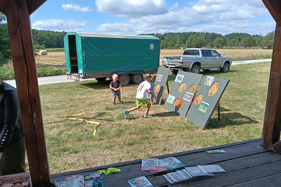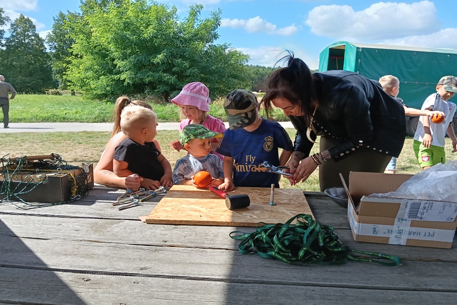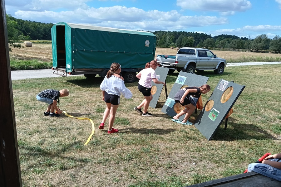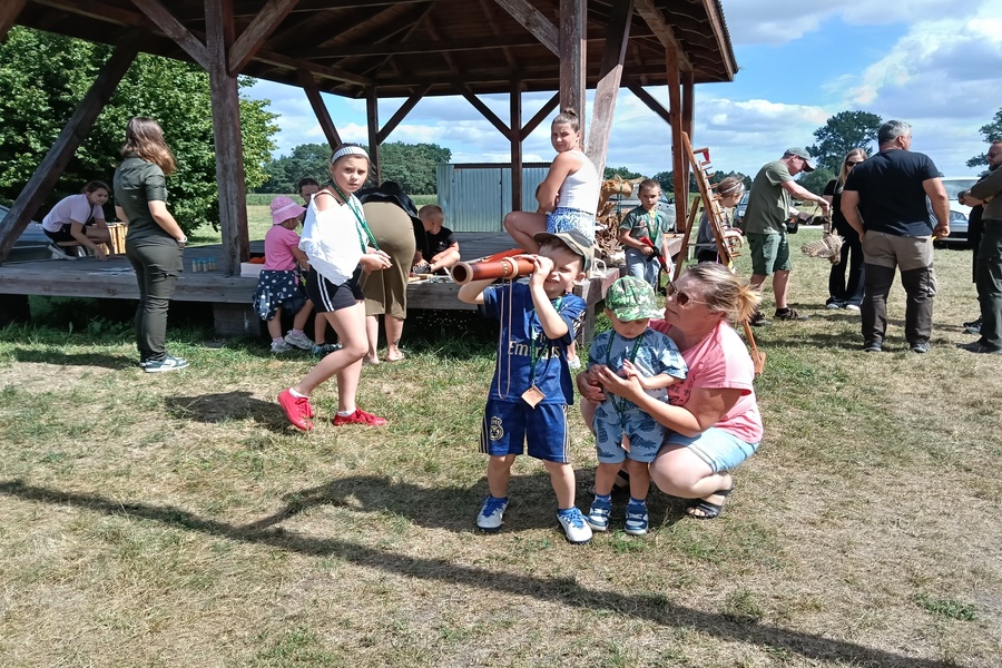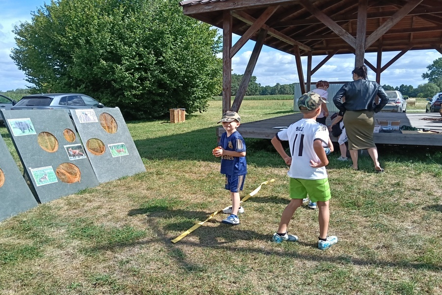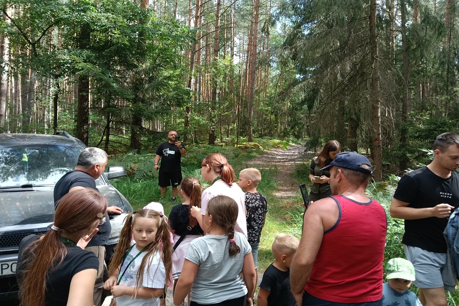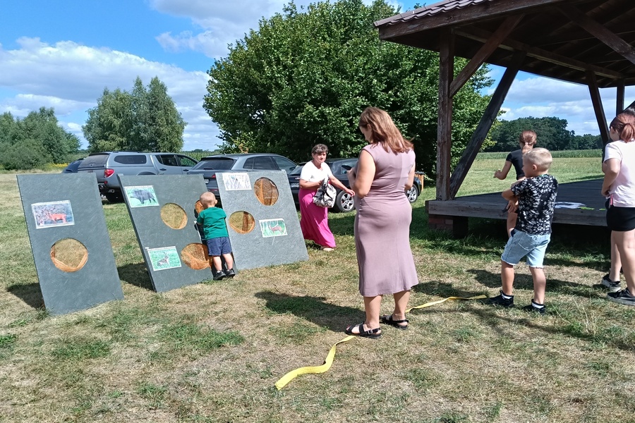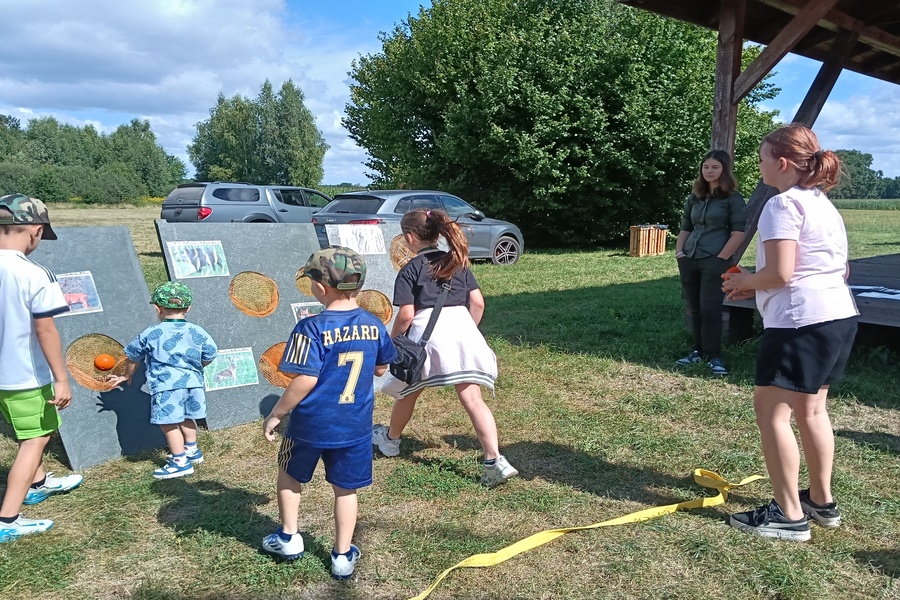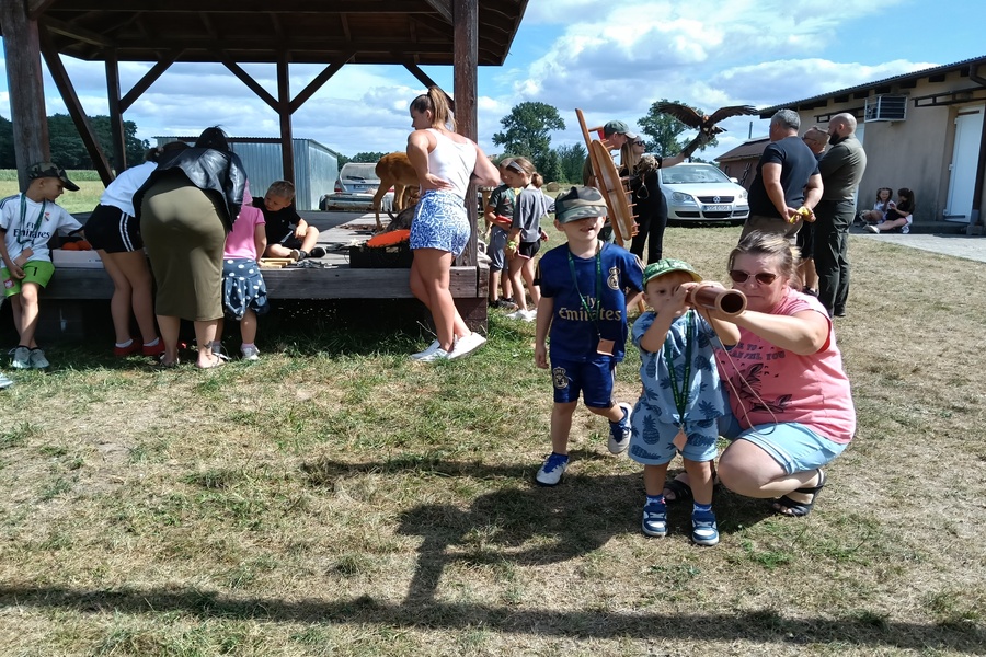 Koło Łowieckie "Sokół" przygotowało dla nas wiele atrakcji. Mieliśmy okazję sprawdzić kto najcelniej strzela. Potem wybraliśmy się na wycieczkę do lasu, żebyśmy mogli poznać wiedzę na temat sieci powiązań międzygatunkowych. Mieliśmy okazję zobaczyć paśnik przy którym zostawiliśmy jedzenie które wcześniej nasyzkowali członkowie koła oraz lizawki dla zwierząt do których dzieci miały okazję włożyć sól. W międzyczasie dowiedzieliśmy się wielu ciekawych informacji na temat sieci powiązań międzygatunkowych. Dzięki uprzejmości pana Sebastiana mieliśmy okazję przyjrzeć się Danielom z jego hodowli. Po powrocie przeprowadzone zostało koło fortuny ze zdobytej wiedzy. Każdy uczestnik po dobrej odpowiedzi wybierał nagrodę. Mieliśmy także szansę przyjrzeć się z bliska jastrzębiowi i sobie, która miała swój debiut. Dlatego też właściciel sowy przeprowadził dla niej wybór imienia. Wygrało imię Sowidka Banditka.