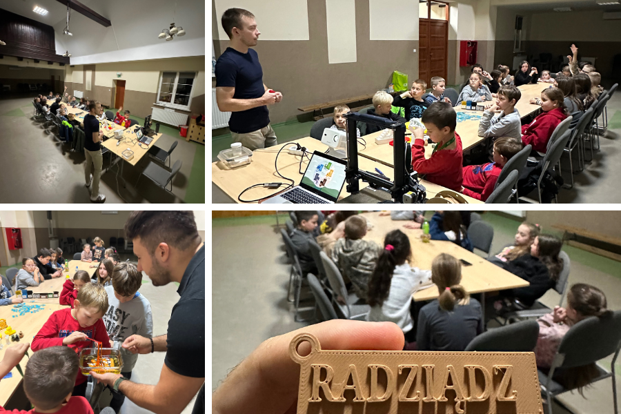 W drugiej części warsztatów uczestnicy przenieśli się w świat technologii – poznali podstawy modelowania 3D i sami zaprojektowali swoje trójwymiarowe wazony. Punktem kulminacyjnym zajęć był wspólny projekt – tabliczka z nazwą wsi Radziądz, którą dzieci zaprojektowały i wydrukowały na drukarce 3D, obserwując cały proces na żywo.